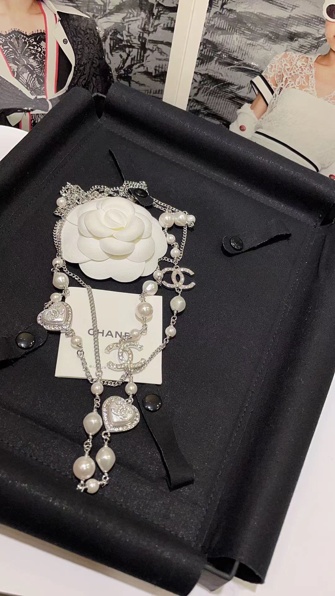 CHANE1 ホワイトピーチハートフルダイヤモンドダブルCセーターチェーン
