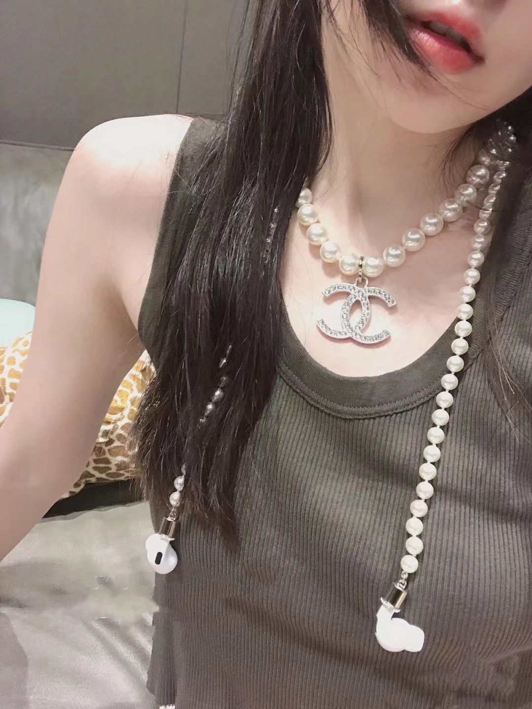 CHANE1 ダブルC ラージロゴパールイヤホンネックレス【50%割引+送料無料】