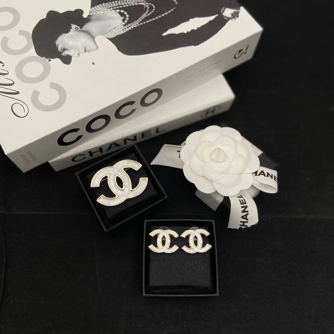 CHANE1 ホワイト ダブルC ピアス+ブローチ 2点セット【50%割引+送料無料】
