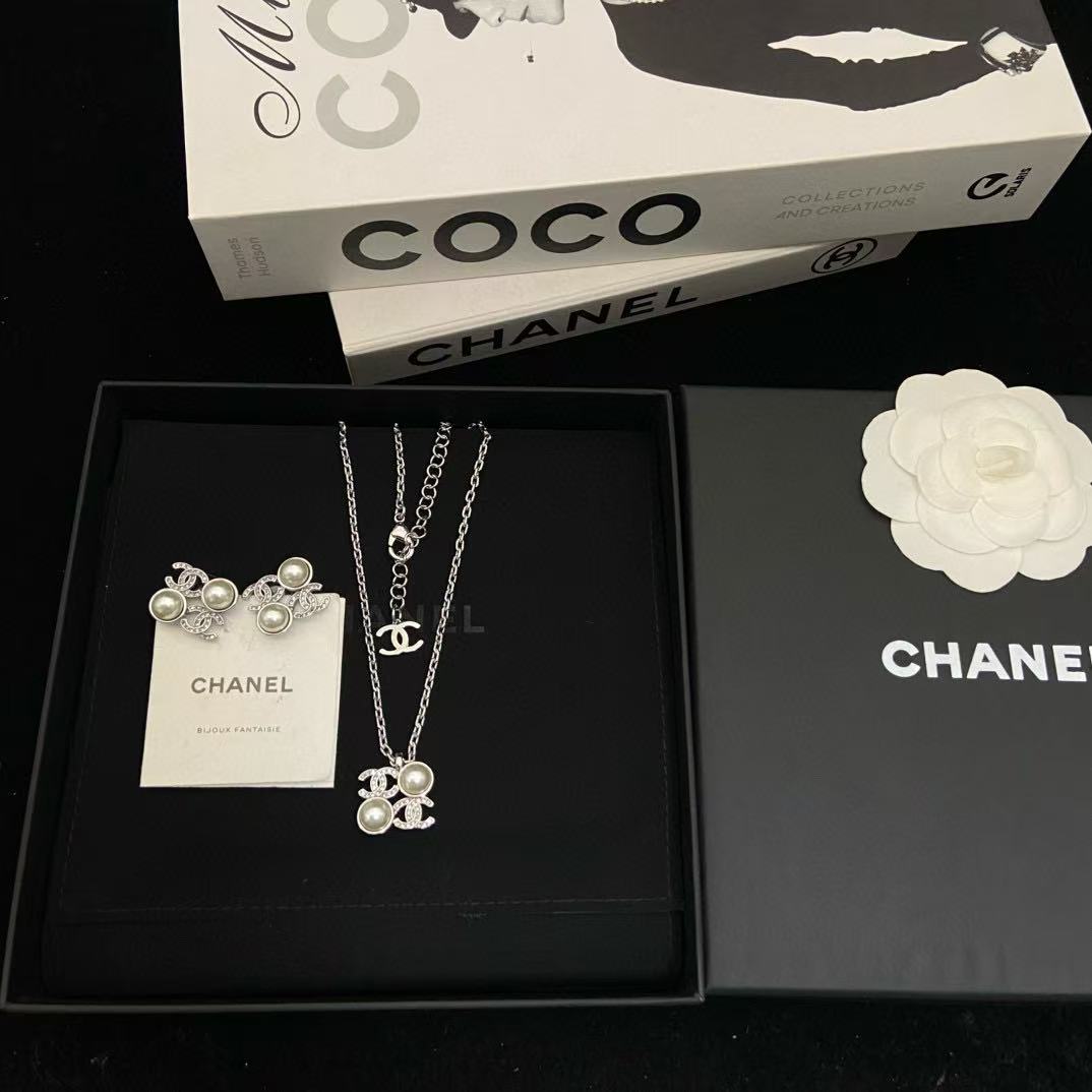 CHANE1 ダブルCパールイヤリング+ネックレス2点セット【50%割引+送料無料】