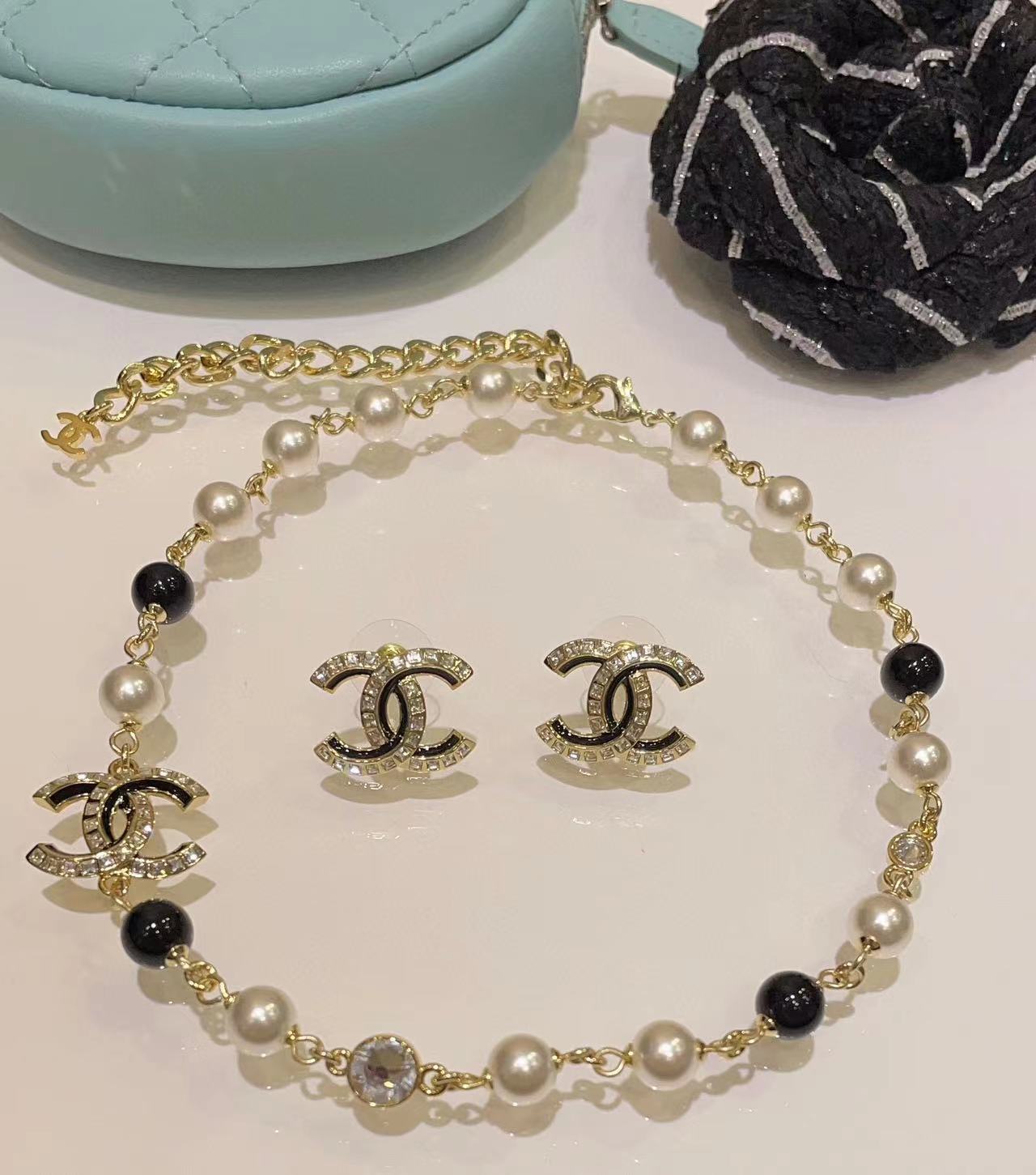 CHANE1 エナメル ダブルC ラインストーン パール イヤリング+ネックレス 2点セット【50%割引+送料無料】