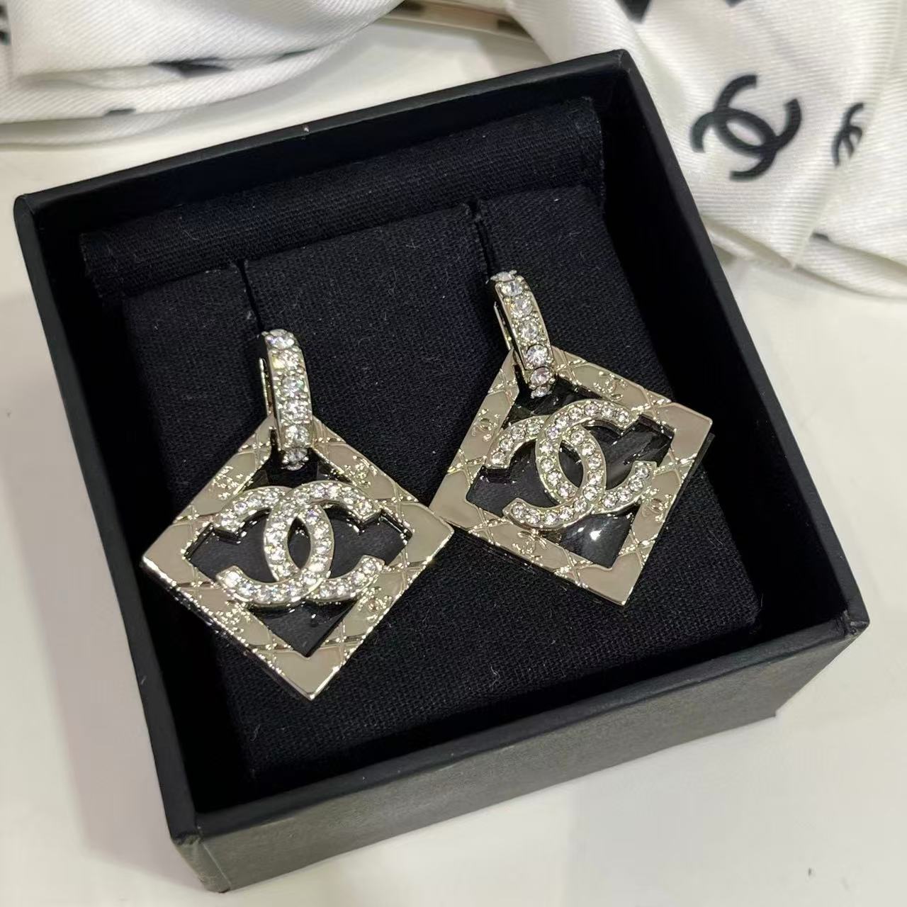 CHANE1 フルダイヤモンド ダブルC スクエアイヤリング【 50%割引+送料無料】