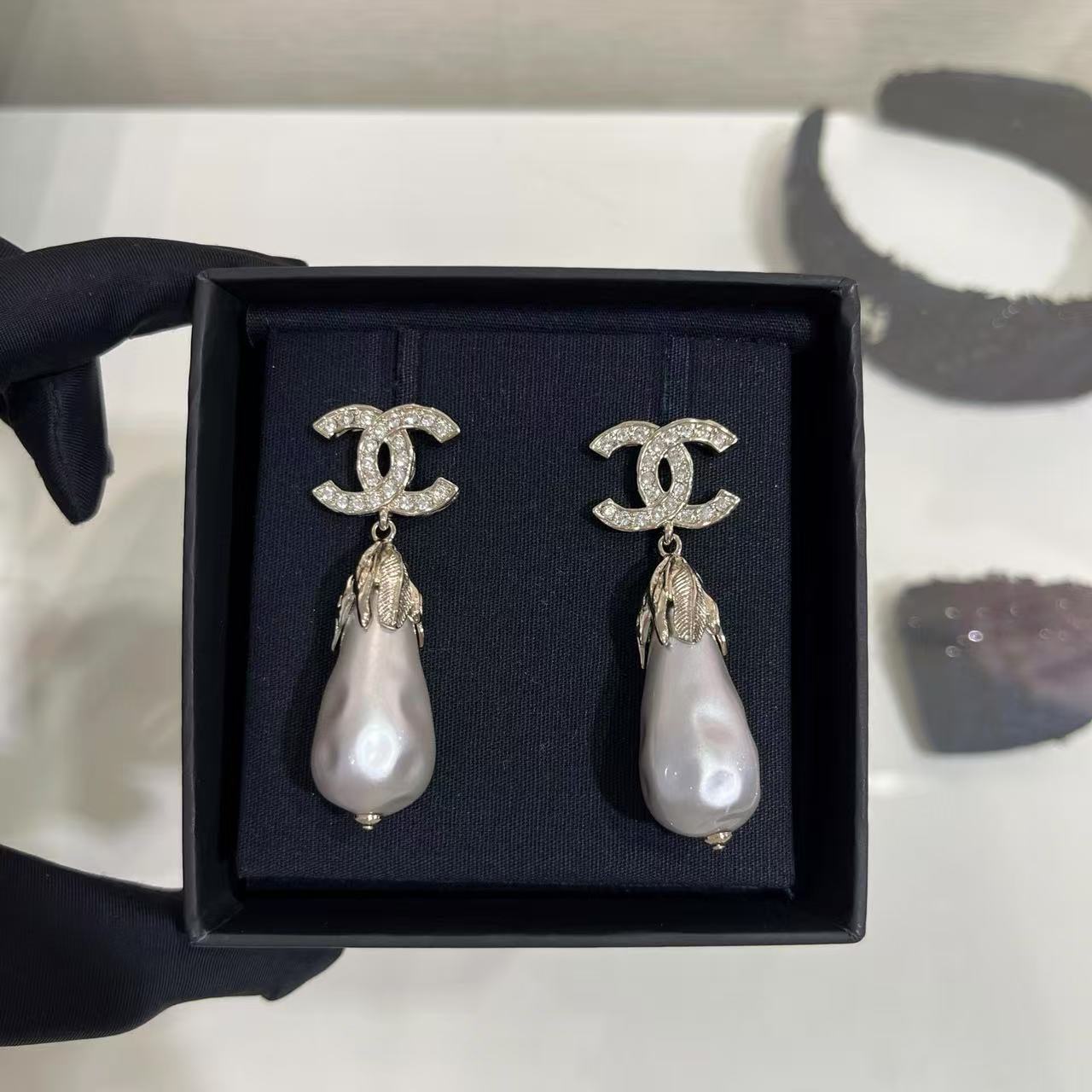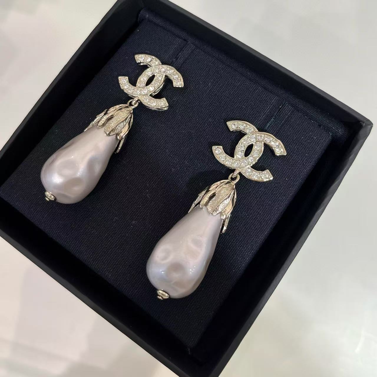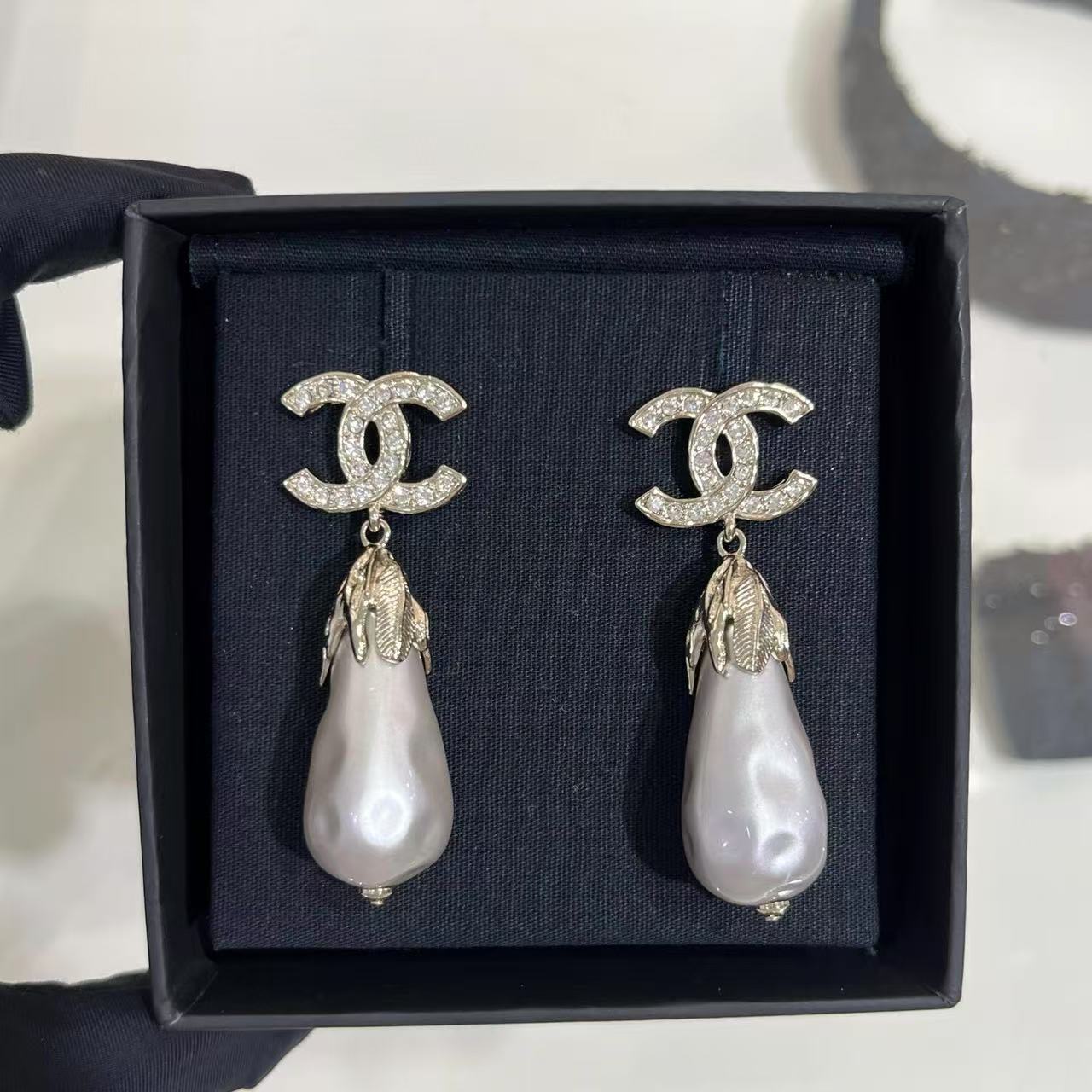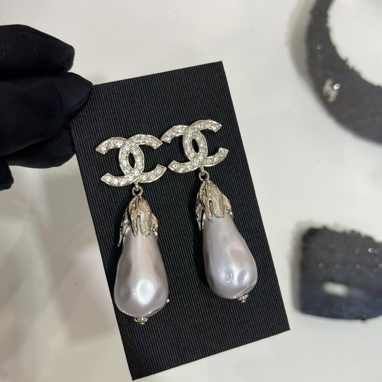 CHANE1 フルダイヤモンド ダブルCフェザー ウォータードロップパールイヤリング【50%割引+送料無料】